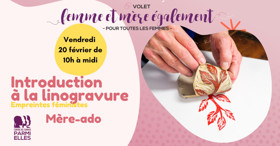 Cet atelier créatif s’adresse aux adolescent·es accompagné·es d’un parent ou d’un adulte significatif. À travers une initiation à la linogravure, les participant·es sont invité·es à explorer des thèmes féministes tels que l’égalité, la liberté, le respect et le pouvoir d’agir. En duo, ils et elles créeront une image ou un message porteur de sens, qui sera ensuite imprimé sur papier.
